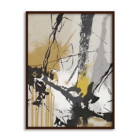 An abstract composition created with intriguing black brush strokes and splashes of yellow