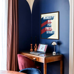 A bold and uplifting typography artwork that brings a dose of optimism to the beginning of every week. Featuring the statement “Mondays are for fresh starts” in striking colours and clean graphic shapes, this print encourages positivity, discipline, and a reset-mindset. The retro-inspired styling adds both motivation and personality to any space.